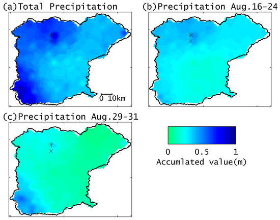 Accumulated distributions of the precipitation from 16 August to 5 September, 16–24 August (Period I), and 29–31 August (Period II), 2016. The spatial distributions were determined by using the ordinary kriging method. Symbols × and ∗ indicate the locations of the Naitai and Nukabira-Gensenkyo rain gage stations respectively, which recorded the large amounts of precipitation that were used as representative data.