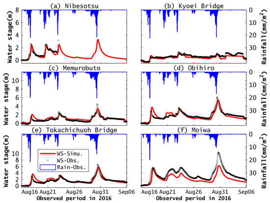 Water-stage comparison between simulation (red line) and observation (black circle) in the main river from the upstream to the downstream with mean rainfall (blue box) over an upstream area from each gage station: (a) Nishibetsu; (b) Kyohei Bridge; (c) Memurobuto; (d) Obihiro; (e) Tokachichuoh Bridge; and (f) Moiwa.