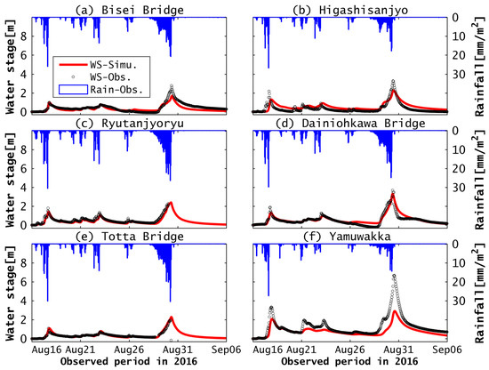 Comparison between simulated and observed water-stages in S-tributaries with mean rainfall over an upstream area from each gage station: (a) Bisei Bridge; (b) Higashisanjyo; (c) Rrutanjyoryu; (d) Dainiohkawa Bridge; (e) Totta Bridge; and (f) Yamuwakka.