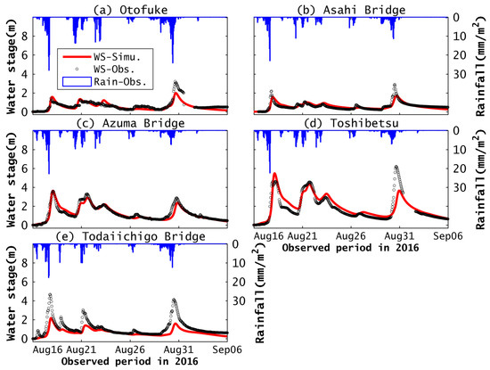 Comparison between simulated and observed water-stages in N-tributaries with mean rainfall over an upstream area from each gage station: (a) Otofuke; (b) Asahi Bridge; (c) Azuma Bridge; (d) Toshibetsu; and (e) Todaiichigo Bridge.