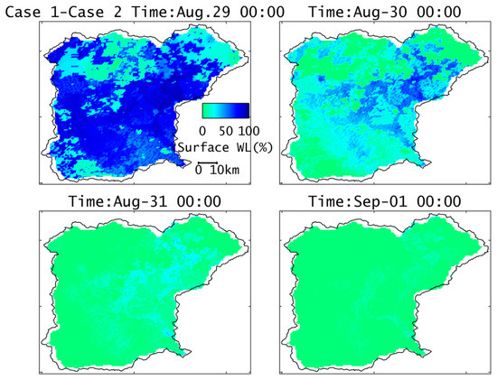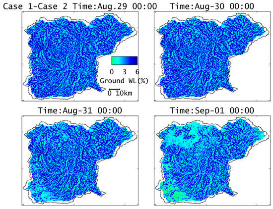 According to a report on the August 2016 disaster [8], saturated soil caused by the preceding three typhoons potentially promoted enormous flood disasters in the west portion of the TR watershed during the approach of the fourth typhoon (i.e., Period II). A simple comparison of the real and artificial simulations associated with soil saturation was performed to quantitatively evaluate the effect of the preceding typhoons on flooding during Period II. The artificial numerical experiment was set up such that no rainfall occurred during the preceding three typhoon attacks (hereafter Period I), but the other meteorological conditions were the same as those of the real simulation (Case 1). Outflows from the flood control dams were provided by the observed discharges at the dam outlets or the estimated discharges, which were computed with dam capacities and inflows when the estimated discharges were higher than the observed ones. We named this numerical examination Case 2. Note that our study focused only on the differences in flood peaks between Case 1 and Case 2. In Figure 6, the difference between both cases shows most water-stage peaks of Case 2 were approximately 4–24% lower than those of Case 1 on 30 August 2016. The peak at Gage 2 (close to Tokachi Dam) was approximately 15% higher than that of Case 1 because the modified flood control at Tokachi Dam was probably inappropriate for Case 2. Figure 6 also shows the peak time when a maximum peak was recorded at each gage during Period II. Half of the peak times in Case 2 were the same as those of Case 1, although several gages recorded up to two-hour peak time delays. For the evaluation of the effect of soil saturation, we gained two quantitative variables: water levels in the surface tank (surface-WL) and the groundwater tank (ground-WL) in the PWRI-DHM outputs. The difference in spatial distributions of surface-WL between Case 1 and Case 2 before Period II was large, with 92% of the spatial distribution of surface WL of Case 1 as the maximum and 60% as the mean over the TR watershed because the surface-WLs of Case 2 were almost zero (Figure 7a). A small rainfall effect for the spin-up time of the simulation still remained and little rainfall by the beginning of the fourth typhoon existed, with a smaller difference in the surface-WLs over the mountain area. The difference became much smaller, reducing from 21% to 1% as the average over the watershed as the amount of precipitation increased (Figure 7b–d). Figure 8 suggests that the spatially distributed ground-WL in Case 2 was slightly reduced, as it represented up to 6% that of Case 1, and the mean was approximately 4% over the TR watershed before and during the early stage of Period II. After the rain event, the ground-WLs of both cases were similar only in the southwest and northwest portions where torrential rain occurred, although the average was still 3% in most areas of the TR watershed.