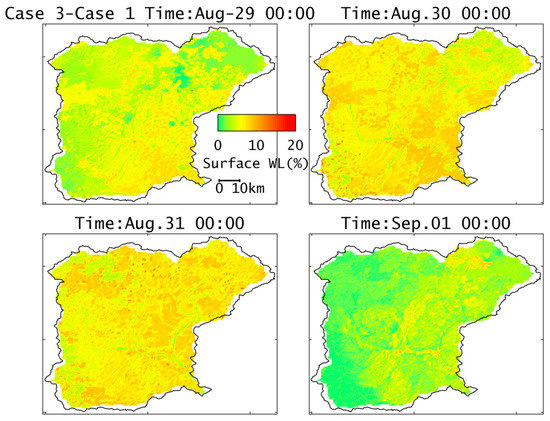 Differences in surface WL between Case 1 and Case 3 (future simulation) before, during, and after the approach of the fourth typhoon over the TR watershed. The increase in the surface-WL was calculated by the formula (surfaceWLCase3 − surfaceWLCase1)/surfaceWLCase1 × 100 (%).