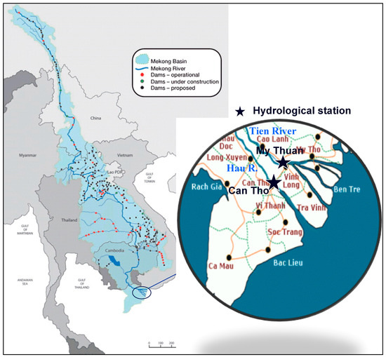 - National Centre for Hydro-Meteorology. Variation of Water Discharge and Sediment Flux at Lower Mekong River; Ministry of Natural Resources and Environment (MONRE): Hanoi, Vietnam, 2017; 15p. (In Vietnamese)