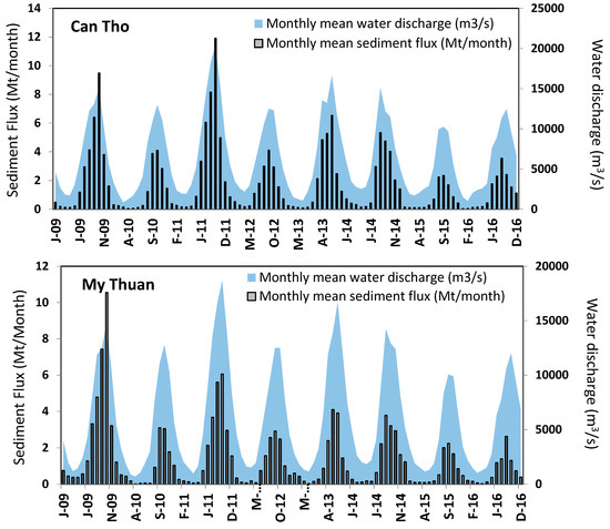 Evolution of monthly mean sediment flux (Mt month−1) and water discharge (m3 s−1) at CanTho (upper panel) and MyThuan (lower panel) stations during the 2009–2016 period.