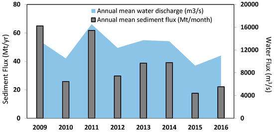 Evolution of annual mean water discharge (m3 s−1) and sediment flux (Mt yr−1) of the Mekong River from 2009 to 2016.