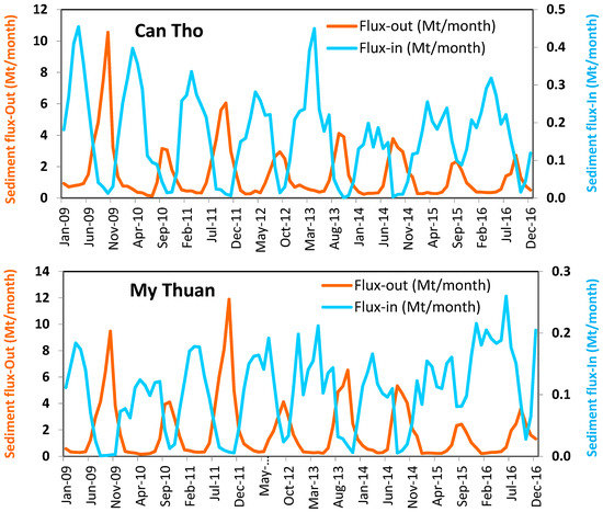 Monthly evolution of the sediment flux-out and flux-in of the Mekong River.