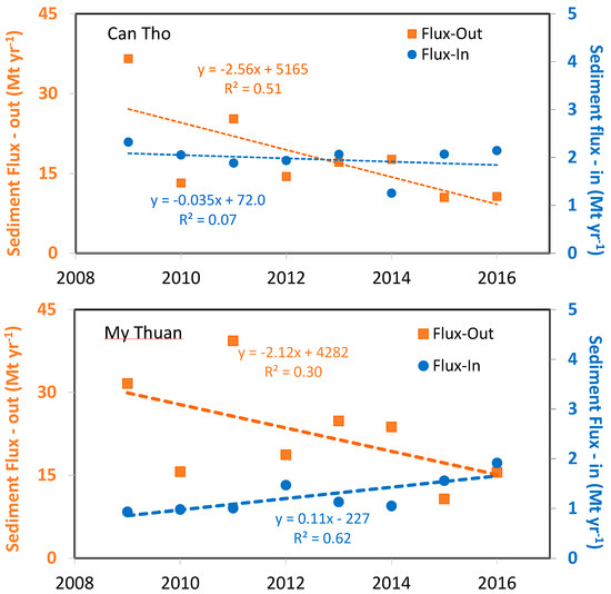 The trend to a decrease in the yearly flux flowing out (Figure 5) should be analyzed with care, since the study period encompassed an excess of discharge at the beginning of the study period with the La Niña event of 2010–2011, and ended with a deficit of discharge associated to the El Niño event of 2015–2016. The flux flowing landward, due to the tidal propagation, seemed to be not affected by the ENSO variation in Can Tho and slightly affected in My Thuan. The trend is almost nil at Can Tho, while a short increase in landward sediment flux was observed at My Thuan station (Figure 5). The difference in the trends between the two stations may be partly explained by other factors than El Niño, such as sand mining activities [66,67].