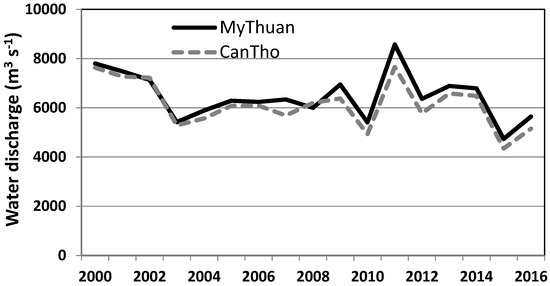 Variation of annual water discharge measured at Can Tho and My Thuan stations during 2000–2016 period. 2000–2008: Data from [85] based on daily water discharge; 2009–2016: This study.