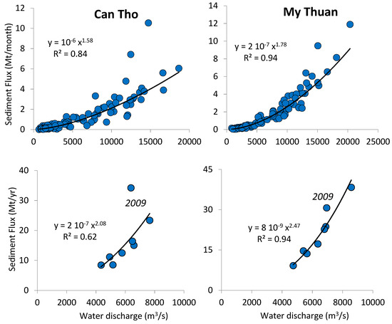 Relationships between monthly sediment flux (Mt month−1) and monthly water discharges (m3 s−1); annual sediment flux (Mt yr−1) and annual water discharges (m3 s−1) at Can Tho and My Thuan for the 2009–2016 period. R2 values were calculated including all months (above) or all years (below).