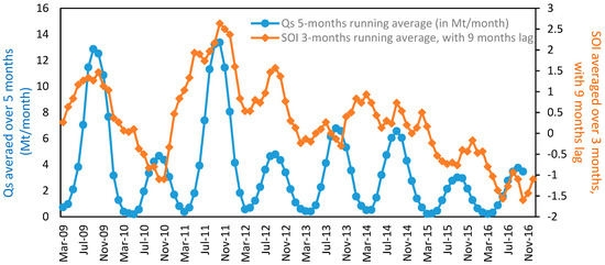 The correlation is positive, indicating that water and sediment supplies are reduced in El Niño phases (SOI < 0) and enhanced in La Niña phases (SOI > 0). The co-variations of Qs averaged over 5 months and SOI averaged over three months with a nine-month lag, is shown in Figure 8. We can check easily that the highest fluxes in 2009 and 2011 are consistent with positive SOI values nine months before (in particular between La Niña event of 2010–2011), and that the smallest fluxes of 2015 and 2016 are consistent with the strong El Niño of 2015–2016 which started to develop late 2014.