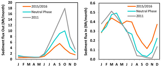 The flux back to the estuaries evolves the opposite of the flux seaward. The effect of ENSO on the sediment fluxes (in and out) is mainly sensitive in flood season (Figure 9).