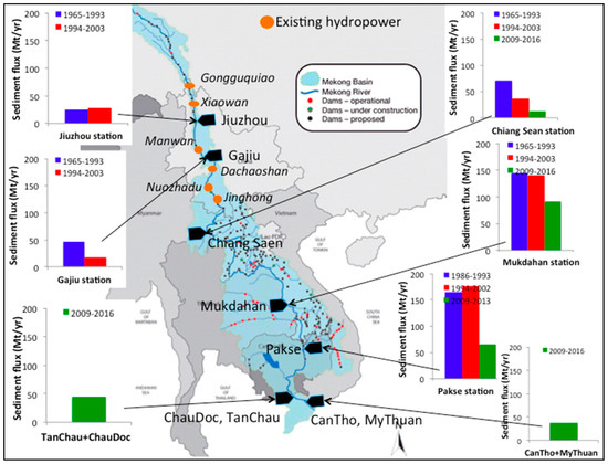 To put our results in perspective over a longer time scale, data extracted from the literature were also considered; they are introduced in the discussion. It was hard to gather data at different stations (from upstream to downstream of the Mekong River basin) and for different periods (pre- and post-dams) with the same frequency sampling (e.g., daily measurements). Before 2009, programs for sediment and water discharge monitoring were discontinuous or had very low sampling frequency. Since 2009, the Mekong River basin has been well gauged, and the daily-hourly water discharge and suspended sediment concentration at major stations have been recorded (especially in the lower part). Thus, a more accurate annual sediment flux transported in the Mekong River can be calculated.