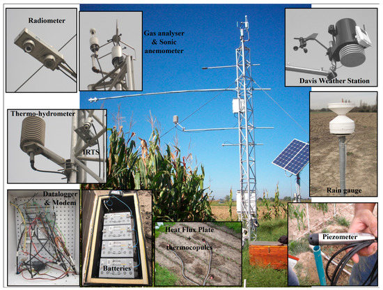 The selected experimental site for this study was an 8 ha maize field located in the middle of Muzza Bassa Lodigiana irrigation consortium in the town of Livraga in Northern Italy (45°11′26′′ N, 9°34′23′′ E) (Figure 1). Within this study site, meteorological and eddy covariance stations were installed [45,46]. The eddy covariance station is equipped with: a 3D sonic anemometer (Young 81000 by Young) placed at 5 m height together with a gas analyzer (LICOR 7500 by LICOR), two thermocouples (by ELSI), a heat flux plate (HFP01 by Hukseflux), a net radiometer (CNR1 by Kipp and Zonen) at 3 m height and an IRTS (by Apogee) for land surface temperature monitoring [46,47,48]. Meteorological data were collected at hourly time intervals. TDR probes (CS 616 probe by Campbell Scientific) were introduced at three depths of the soil profile: 10 cm, 30 cm and 70 cm. Soil moisture measurements in this field were monitored for both uncultivated (bare soil) and cultivated parts. For this study, only the cultivated part was considered. A weighted average of the three measurements was calculated giving the soil water content of the root zone.