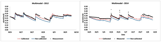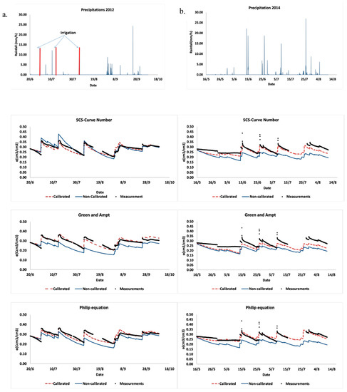 The FEST-WB distributed hydrological model [47,49] was used for the simulation of soil moisture dynamics. Different infiltration models were implemented within FEST-WB. The initial soil moisture conditions were fixed according to the field measurements. Simulations were carried out for a homogeneous soil profile with 50 cm depth where the plants roots were mostly concentrated. Soil water content data from the study site were used to calibrate the model for the cropping season of 2012, while 2014 data were used to validate it. Bottom boundary conditions were set to free drainage conditions. The water flow in the vadose zone was not affected by the water table located at more than 2 m depth below soil surface. Upper boundary condition was controlled by atmospheric conditions (evapotranspiration and precipitation).