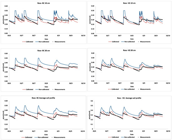 The implementation of Ross model gave us the possibility to assess the performances of the simulations of the soil moisture at the two observation points 10 cm and 30 cm (Figure 4 and Figure 5). The performances of Ross model were assessed at these two depths as well for the average soil profile (Table 7). Although based on different parametric equations for soil water retention and conductivity curves, similar performances were achieved for both Ross-VG and Ross-BC with RMSE of 0.0276 and 0.0263 for the calibration year and RMSE of 0.0231 and 0.0211 for the validation year, respectively. The lowest performances were attributed to the first 10 cm of the soil profile. At this depth, for the calibration year the RMSE and R2 for Ross-BC were 0.035 and 0.49 while for the validation year were 0.032 and 0.28, respectively. For Ross-VG, these values were 0.041 and 0.53 for the calibration year and 0.034 and 0.33 for the validation year, respectively. The top soil was subjected to high fluctuations of soil moisture, which caused more soil moisture variability that was observed in the measured water content at 10 cm soil depth. This is also because the top soil is more subjected to the evaporative fluxes as well as to the disturbance of the soil structure during the cropping season. One set of parameters was considered for whole soil profile that is supposed to be homogeneous. Capturing these fluctuations was not possible when the average soil moisture of the 50 cm soil profile was considered.