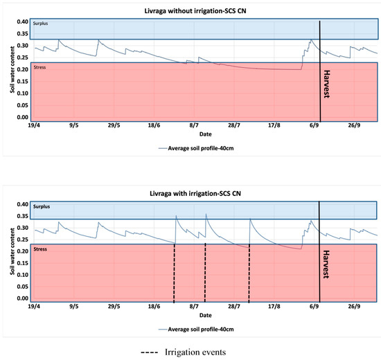 The most critical concern for irrigation scheduling, is the timing at which the water content reaches stress threshold, which in this study is equal to 0.23 cm3/cm3. The uncertainty of the model, implemented as decision support tool to plan irrigation water applications, is critical. About this issue, we selected SCS-CN and Ross-VG to carry out our analyses. Figure 6 and Figure 7 present the results of simulations based on Ross-VG and SCS-CN respectively. Simulations without irrigation showed that more stress conditions appeared in particular during summer season when the crop was fully developed. The occurrence of surplus conditions could not be avoided and occurred after a heavy rainfall or irrigation. Simulations based on SCS-CN did not allow assessing the water stress presence at different soil depths. The irrigation should be applied when the stress threshold is reached. In terms of evaluation of effectiveness of the irrigation based on the Figure 6, it can be concluded that at irrigation was applied at a good timing when the soil water content reached the stress threshold. This irrigation allowed avoiding stress conditions that were observed for the no-irrigation scenario.