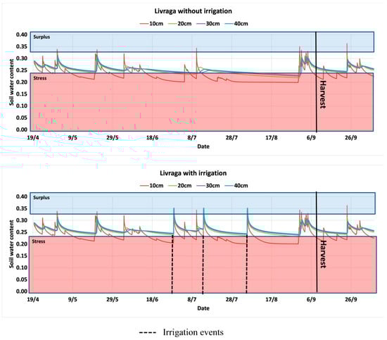 where θFC the water is content at field capacity [L3/L3] and θWP is the water content at the wilting point [L3/L3]. p is the allowable depletion that depends on the crop was assumed equal to 0.5 for maize crop [50]. The water surplus takes place when the value of the soil moisture exceeds the θFC.