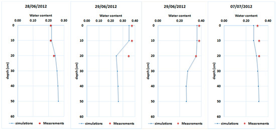 As presented in Figure 8, the simulations reproduced quite well the measured values at different depths. The first presented soil profile on 28 June corresponds to dry conditions while the second and third profiles corresponds to wet conditions under irrigation on 29 June. These profiles show the ability of the FEST-WB when Ross solution is implemented to capture the variability of soil moisture under dry and wet conditions when compared to field measurements. During the irrigation event (the first profile of 29 June), an increase of the soil moisture was observed within the first 10 cm at a first step, then few hours later (the second profile of the 29 June), the wetting front moved downward to deeper soil. Few days after the irrigation event on 7 July, a depletion of the water content was observed in particular at the surface. This information is very important if the model will be used as decision support for irrigation management in particular for localized irrigation systems.