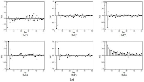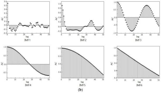 - Establish appropriate ARIMA models with appropriate parameters for each IMF and residual. Box and Jenkins [] set the standard for modeling stationary time series by using ARIMA model. The detailed modeling process of ARIMA model mainly includes: ① Let { ∈ Z: t = 1, 2, …, N} denotes the time series that need to be modeled; ② Check whether satisfies the condition of stationary time series by the unit root test. If the time series is a non-stationary time series, that means there are unit roots in the time series, and the original time series needs to be differentiated to obtain a stationary time series ; ③ Select appropriate models (AR model, MA model or ARMA model), and the lag order can be based on an autocorrelation (AC) function and the partial correlation (PAC) function of the stationary time series ; ④ Estimate the parameters in the model. If some of the parameters in the middle lag are too small, the parameters are not significant (the significance level used in this study is 5%); these lag orders need to be removed from the model; ⑤ Residuals of the model are determined to be white noise or not; if residual sequences are white noise, the autocorrelation coefficients of non-zero lag are all zero. This can be tested by the Q statistic (shown in Equation (13)) proposed by Box et al. [] and Ljung et al. [].where is the sample’s autocorrelation coefficient, and if the sample size is large enough, . The Q-statistic approximately obeys a distribution and the degree of freedom is s. If the residual sequence is not white noise, then the model needs to be improved; ⑥ The model with the minimum AIC (Akaike Information Criterion) [] is chosen as the optimal model from many models which satisfy the conditions in steps ②–⑤).