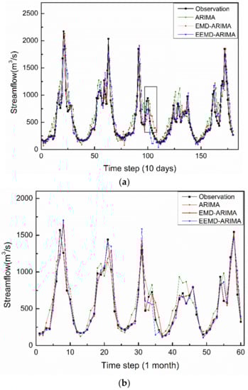 Table 1 indicates that the EMD-ARIMA hybrid model outperforms both EEMD-ARIMA and ARIMA models with the smallest MAPE, RMSE, and MAE for both ten-day and monthly prediction. The fitting degree, R, of the EMD-ARIMA model is above 0.9 for the ten-day prediction and as high as 0.95 for the monthly prediction. Even for the EEMD-ARIMA model, R is 0.89 and 0.95 for ten-day and monthly prediction, respectively. The correlation coefficients R of the monthly prediction by both EMD-ARIMA and EEMD-ARIMA hybrid model are both higher than the previous studies of Zhu et al. [], Zhang et al. [], and Kisi et al. [], which use rainfall and runoff data, or monthly data directly. The performance of RMSE, MAPE, MAE and R of the monthly prediction is higher than that of the ten-day prediction in all models. The reason for the difference is that some errors in the prediction with a small time interval might be smoothed in the statistics for the longer time interval.