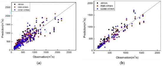 Figure 5 shows the scatter plots of the predicted and observed streamflow of ten-day average and monthly data individually. The black square, red circle and blue triangle represent the predictive value corresponding to observation by ARIMA model, EMD-ARIMA, and EEMD-ARIMA hybrid models, respectively. The closer to the black line, the more accurate the predictions are.