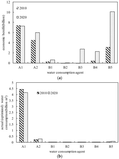 The physical meaning of Equation (18) is that the marginal benefit of each water agent is the same. That is, the water resources will be transferred from the agent with a lower marginal benefit to those whose marginal benefit is larger than the average benefit. This will lead to maximum gross regional production.