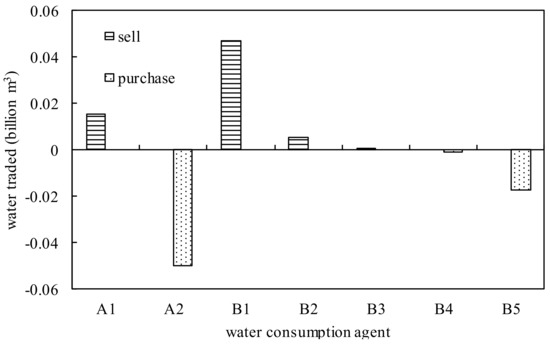 On the other hand, the concept of an administered system in this paper is an optimization system with top-down integral management from the perspective of the government, the central idea of which is that transactions in the water market are rational and transparent, and the trade between various agents is under the unified management of the government instead of the free market economy. In a free water trade market, there is a bidding game between the sellers and buyers, which may cause an unreasonable imbalance in water resource distribution. Probably, the imbalance means greater economic benefits for certain agents, but this is far from the optimal configuration when considering the overall economic benefits of the region. For future research, a bidding mechanism reflecting market economic regularity should be introduced into the model to explore water rights transactions and optimal water resource allocation under a market-based system for a comparison to the results under the administered system.