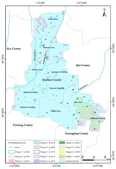 The county has also implemented forestry projects (project 7) in 2015. The planting area was 0.7 km2, located at Quzhou Town and Yizhuang Township (Figure 1).