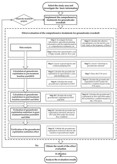 The overview of the study is illustrated by the following procedures. Considering all factors, we chose Quzhou County as the research area. After investigating all the basic information in Quzhou County, the implementation of treatment projects was carried out in the overdraft regions, which called project regions. Now, the main work of this study is to assess whether these projects have played a positive role in relieving and restoring the groundwater overdraft in the study area. The purpose of the evaluation is that, if the results of the evaluation are effective, we will affirm the treatment projects and analyze the results of the evaluation; if the results are not effective, we will make suggestions to adjust the treatment projects. The evaluation process are shown as the Figure 2, including data analysis, calculation of groundwater exploitation in pre-treatment baseline year, calculation of groundwater exploitation in post-treatment baseline years, evaluation of groundwater exploitation restriction in post-treatment baseline years, and verification of the groundwater exploitation restriction effect by groundwater depth variation. The effect evaluation is completed by 13 steps as shown in Figure 2.