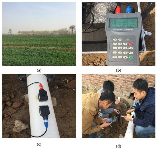 Pumping test in the field. (a) Wheat field in project region; (b) Handheld Ultrasonic Flow Meter (Flowmeter, HT-003UF, Beijing, China); (c) The sensor of Handheld Ultrasonic Flow Meter (Flowmeter, HT-003UF, Beijing, China); and (d) Experimental field. The photos were taken by Dr. Xu Ting in the project region in Houcun, Quzhou County on 30 March 2016; there are no copyright issues for these pictures.