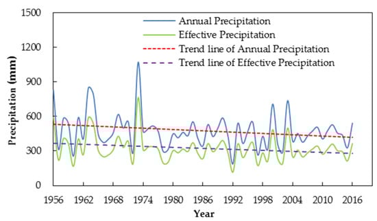 According to the temporal variations of precipitation and effective precipitation from 1956 to 2016 in Quzhou County, the inter-annual precipitation showed a significant fluctuation, and it presented a gradual decline trend with a decline rate of 18.7 mm/(10 year) on the whole (Figure 4). Effective precipitation also presented the same change trend with a decline rate of 14.6 mm/(10 year). The multi-year average precipitation and effective precipitation were 474.5 and 321.1 mm, respectively. The minimum precipitation and effective precipitation were 187.5 and 115.7 mm, respectively, which occurred in 1992, while the maximum precipitation and effective precipitation were 1069.6 and 763.6 mm, which were 5.7 and 6.6 times the minimum value, respectively, which happened in 1973. From the above results, the annual precipitation was distributed unevenly.