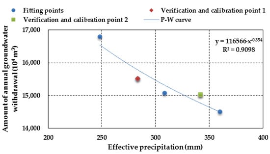 The P-W curve means the relationship curve of the effective precipitation and agricultural groundwater exploitation amount. Effective precipitation is related to crop water requirement and inter-annual precipitation distribution. For specific crops, there are differences in the amount of precipitation used by crops under the same annual precipitation and different annual precipitation distribution. Crop water requirements, which have not been satisfied by effective precipitation, need to be supplemented by agricultural irrigation. As groundwater is the main source of irrigation water in this county, there is a correlation between effective precipitation and agricultural groundwater exploitation. The greater the ratio of effective precipitation to crop water demand, the smaller amount of agricultural groundwater exploitation are needed, and vice versa. By drawing the P-W curve, we can understand the change relationship between agricultural groundwater exploitation and effective precipitation more thoroughly. Based on the data we have obtained, we used the effective precipitation and agricultural groundwater exploitation amount in the representative years of high (2012), normal (2005), and low (2006) flow ((Pe-h, Wh), (Pe-nor, Wnor), (Pe-l, Wl)) of the county to get a power curve in the X-Y coordinate system. Then, we chose two other years (2008 and 2013) in the recent 10 years to validate and calibrate the curve. After using the corresponding data to check the power curve, we finally obtained the optimal P-W curve (with determination coefficient R2 = 0.9098) (Figure 5).