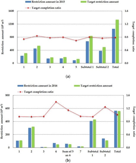 The restriction amount of agricultural groundwater exploitation in the project regions in 2015 (a) and 2016 (b) of Quzhou County. Restriction amount means the restriction amount of agricultural groundwater exploitation under normal flow conditions in evaluation baseline years (2015/2016); Sum of 5 and 6 mean the total amount of project 5 and project 6; Subtotal 1 represents the total restriction amount of the water conservancy projects; Subtotal 2 means the total restriction amount of the agricultural projects; the project numbers are the same as mentioned above.