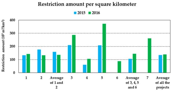 Restriction amount per square kilometer under normal flow conditions in the project regions (thousand m3). The project numbers are the same as mentioned above.