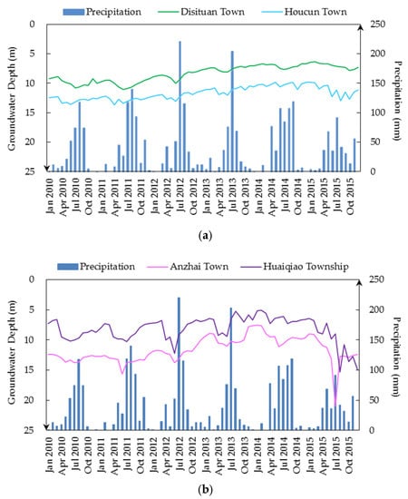 There are many factors that affect the change of groundwater level, such as groundwater pumping, climate change, and land-cover change [,]. In our study area, groundwater pumping and precipitation variation are the main influences. Therefore, we mainly consider the influence of these two factors. The change of groundwater depth can directly reflect the change of groundwater volume. We have compared the annual average groundwater depth after treatment with the annual average groundwater depth before treatment. In order to eliminate the effect of precipitation change, we choose the similar year of precipitation to compare. The results show that the groundwater depth after treatment has been restored compared with that before treatment, with a rise of 2.8 m in Disituan Town and 1.6 m in Houcun Town, respectively (Table 5). At the same time, the continuous variation of the groundwater depth in project regions all showed an ascending trend from 2010 to 2015, with a rising rate of 0.6 m/(10 year) in Disituan Town and 0.5 m/(10 year) in Houcun Town (Figure 8a). It is proved that the groundwater depth has been restored after the implementation of the treatments. However, when the groundwater depths in the project regions present upward trends, the groundwater depths of the wells in the non-project regions, showed decreasing trends, and were accompanied by obvious fluctuation (Figure 8b). The groundwater depths of the two wells both have significant downward trends every summer. This may be due to the large area irrigation of crops in early summer. The downward trend was also particularly obvious in 2015, when it was a low flow year. The decline speed was as high as 8 m from June to July of the observation well in Anzhai Town in 2015. The average annual groundwater depths in 2015 were declined by 1.7 m in Huaiqiao Township, when compared with 2010 (Table 5). This indicates that the groundwater depths kept decreasing in the areas where no restriction measures were implemented. It is urgent to undertake comprehensive treatment in these areas to restore groundwater depth, otherwise the groundwater will be in danger of exhaustion. In combination with the above results, we can draw a conclusion that the restriction measures have an effective influence on the recovery of the groundwater depths. It is in accordance with the previous conclusions.