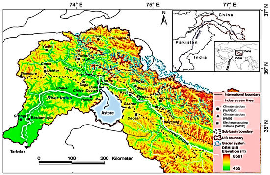 The Indus River Basin includes an area of around 970,000 km2. The Upper Indus Basin begins at the source of the Indus River, and ends at the Tarbela Reservoir, covering an area of around 175,000 km2 [30]. The snow-fed sub-catchment of the Astore (the sub-basin of Upper Indus Basin) was selected for streamflow analysis. The Astore catchment is located in the region of Gilgit-Baltistan, and is approximately 120 km long, with an area of 5092 km2, and an elevation range from 1213 m to 8069 m with respect to the mean sea level. The streamflow in the Upper Indus Basin is due to snow and glacier melt. Thirteen percent of the Astore Basin is glacier covered and nourished by the westerly circulation, bringing maximum precipitation during winter in the form of snow. Therefore, the flows of the Astore River are influenced by the westerlies during winter; however, low-altitude winter rainfall also overlaps the snow and glacier melt [31]. The Astore basin was selected for this study due to its key geographical position (in the southern foothills of the Western Himalayas). The location of the Astore catchment in the Upper Indus Basin is shown in Figure 1. Furthermore, the locations of the Upper Indus Basin in Pakistan and in the world are shown, within the figure, in the big and small squares, respectively.