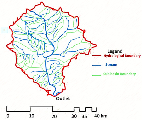 Obtained from Quantum Geographic Information Software [34] as a shape (.shp) file, the delineated image was imported to the HEC-HMS as a background map. The image was then inverted to effect a downward flow direction as required by the HEC-HMS (Figure 2).
