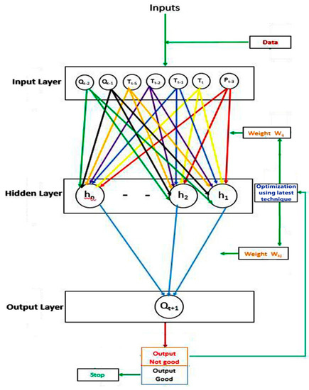 ANN models are used to address highly complex problems, and many investigators performing time-series hydrologic analyses have reported their success in establishing nonlinear relationships amongst input data and desired outputs [41,42,43]. ANN s consist of several “layers” of neurons, including an input layer with nodes representing various input variables, a hidden layer with many hidden nodes, and an output layer. The general architecture and a flowchart of ANNs are shown in Figure 5. For streamflow simulation, the ANN method requires selecting the best variables, functions, weights, and optimization techniques, which requires an objective function based on errors between the simulated and measured streamflow. Therefore, during the optimization process, the values of the parameters are selected so that the objective function achieves the minimum possible value (which is usually called the global minimum). A number of techniques are available to alter the parameters of the model in every iteration and search for the minimum value of the objective function. Derivatives of the objective function and constraints are used by some optimization techniques, while others do not require such derivatives and constraints. In streamflow prediction models, algorithms such as the quasi-newton, Levenberg–Marquardt, and conjugate gradient can be effectively utilized for standard numerical optimization due to its robustness [44,45]. In this study, the conjugate gradient training algorithm is used to simulate the streamflow for the Astore River Basin, and for comparison with the streamflow predicted from the HEC-HMS.