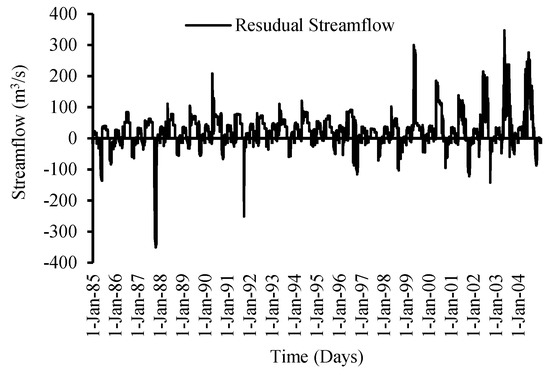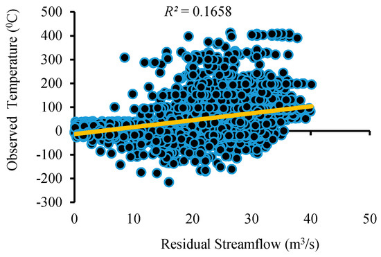 Figure 11, Figure 12, Figure 13 and Figure 14 also show a decreasing trend in the rainfall runoff as a result of increasing temperatures in the region. The result shows a proportional relationship between streamflow and temperature during the validation period (Figure 12). It is evident from Figure 15 that residual streamflow/runoff (the flow in excess of the rainfall) is due to the melting of glaciers caused by increasing temperatures in the region throughout the year.