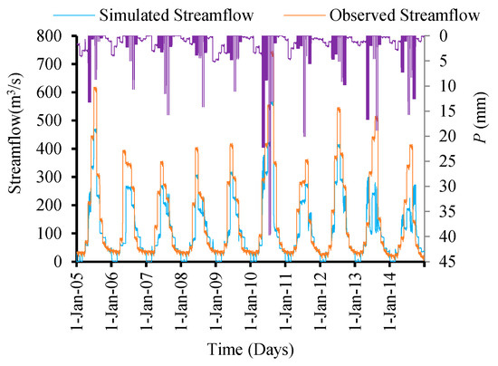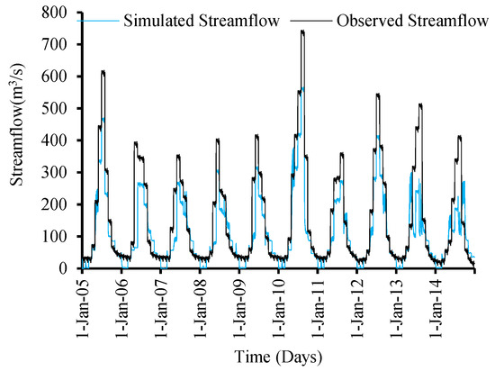 Observed and simulated flows for the validation period between 2005–2014 are also shown in Figure 10. The results for this validating period represent a similar pattern to that of the calibration period, with satisfactory values of statistical indicators. However, it shows underestimated flows in summer, but comparatively fewer overestimated flows in spring and autumn (Figure 10).