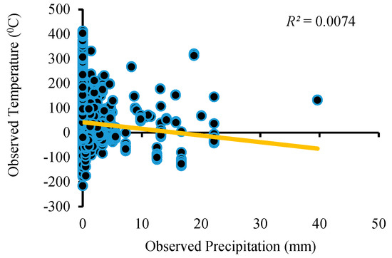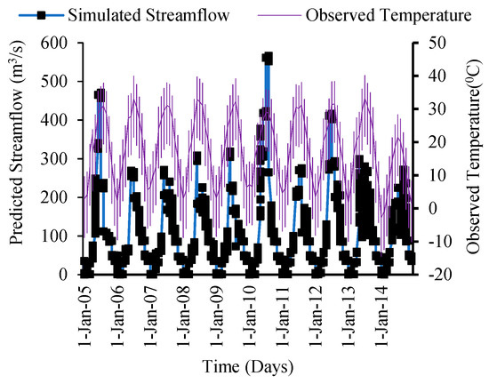Figure 11, Figure 12, Figure 13 and Figure 14 describe the relationship between precipitation and temperature with observed and simulated streamflow. The figures clearly show that both precipitation and temperature impact runoff. When rainfall is zero, streamflow is never zero, and there is considerable runoff in the study region, which is obviously due to the melting of the glacier part of the catchment as a result of the comparatively high temperatures during the summer season and obtaining a mostly subsurface flow at the Doyian gauging station.