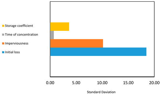 For the sensitivity analysis, four parameters were investigated: initial loss, imperviousness, time of concentration, and storage coefficient. The mean, standard deviation, and range of these parameters were determined. Sensitivity analysis using Monte Carlo analysis was performed on these parameters, and their sensitivity was determined using 500 trials assuming simple distribution. The most important parameters were found to be the storage coefficient and time of concentration, which are interrelated.