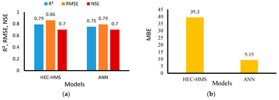 Following calibration, the models were compared with each other. Both the data-driven ANN models and distributed hydrologic models entail their merits and demerits. The HEC-HMS model is comparatively more efficient than ANN; however, the HEC-HMS requires a significant effort to determine the model parameters. Jimeno-Sáez et al. and Derdour et al. [2,59] report similar findings when comparing a soil and water assessment tool (hydrologic model) with the ANN.
