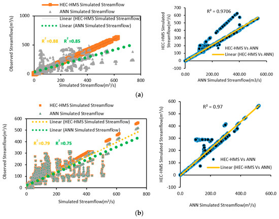 (a) Calibrated R2 Value for Streamflow by HEC-HMS and ANN Models; (b) Validated Coefficient of Determination R2 Value for Streamflow by HEC-HMS and ANN Models.