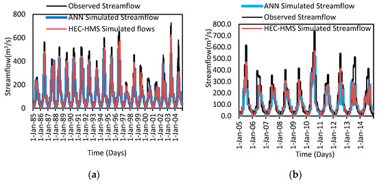 Comparison of the Observed vs. Predicted Streamflow by HEC-HMS and ANN Models, (a) Calibration/Training and (b) Validation/Testing.