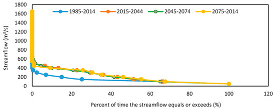 The flow duration curves were plotted for the predicted streamflow, which presents the complete historical changes related to streamflow in the river basin. It was evaluated that extreme events (floods and droughts) are expected to occur in the studied river basin in the near and distant future. Familiarity with the details of the flow duration curve will aid in understanding the characteristics of a river basin and the knowledge needed in hydrologic studies.