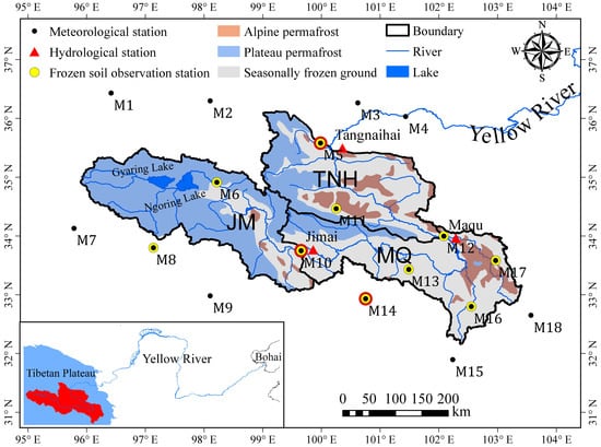 Relative location of the three sub-basins (Jimai (JM), Jimai-Maqu (MQ), and Maqu-Tangnaihai (TNH)), distribution of frozen ground, and meteorological and hydrological stations (the red circles indicate stations that have the longest frozen-ground record in their respective sub-basin).