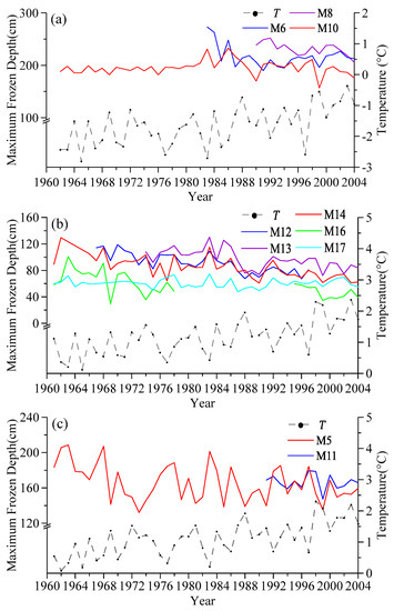 As shown in Figure 2, the MFD values for JM and TNH varied from 120 to 300 cm; however, MFD values for MQ were generally lower than 120 cm. As air temperature increased, the MFD exhibited a decreasing trend at most of the observation sites, particularly in the period after 1980. The MFDs at each station in and around the same sub-basin showed a similar trend; thus the station with the longest record was selected to account for the representative MFD data in each sub-basin. Therefore, M5, M10, and M14 were selected for JM, MQ, and TNH, respectively. In the MQ sub-basin, M17 also had the longest record but showed little variation compared to the other sites, because it was located at alpine permafrost. Therefore, M17 was not selected to represent the MFD of MQ. The locations of M5, M10, and M14 are shown in Figure 1. The station M14 was not located in the MQ sub-basin, but it exhibited the same variation trend in MFD as that observed at stations in the MQ basin (M12, M13, and M16) with shorter records.