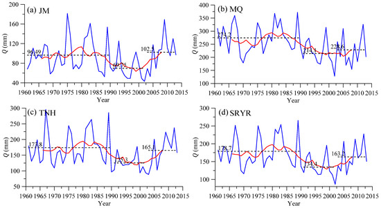 Time series of annual discharge, Q, in the three sub-basins and the source region of the Yellow River (SRYR). The dashed, red, and blue lines indicate the mean values in different periods, 11 year moving average value, and annual mean value of discharge, respectively.