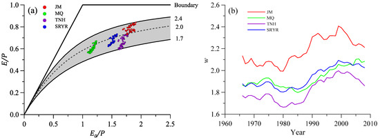 The shift paths of the basin-scale water balance were plotted in the Budyko space (Figure 5a). Each point in the Budyko space could be located to a given Budyko curve by changing the w value for Fu’s equation. Typical Budyko curves for w = 2.4, 2.0, and 1.7 are also shown in Figure 5a for comparison. The gray area in Figure 5a indicates a zone confined by the Budyko curves with the maximum and minimum w values. Using the 11 year moving average values of P, E0, and Q, the time-varying w value was obtained using Fu’s equation. As shown in Figure 5b, the time-varying values of w in the three sub-basins and the SRYR significantly increased during 1980–2000. In the 21st century, this increasing trend continued for MQ but stopped and transitioned to a declining trend for JM, TNH, and the SRYR. MQ had the lowest dryness index (E0/P), but its w value ranged between the w values of JM and TNH. The data points generally showed a positive relationship between the evapotranspiration ratio (E/P) and E0/P, with slopes that were steeper than the slope of traditional Budyko curves with a constant parameter, indicating that ΔQw plays a more important role than ΔQ0 in the discharge change (ΔQ) of the SRYR and the three sub-basins (ΔQw and ΔQ0 refer to Figure 3a).